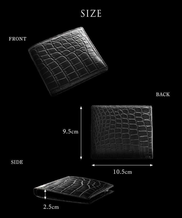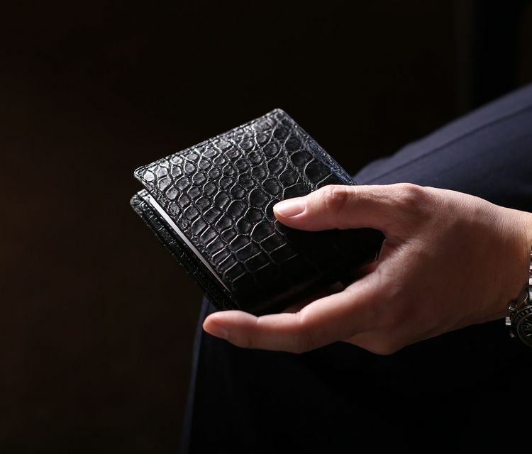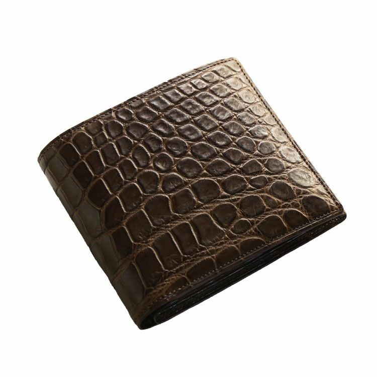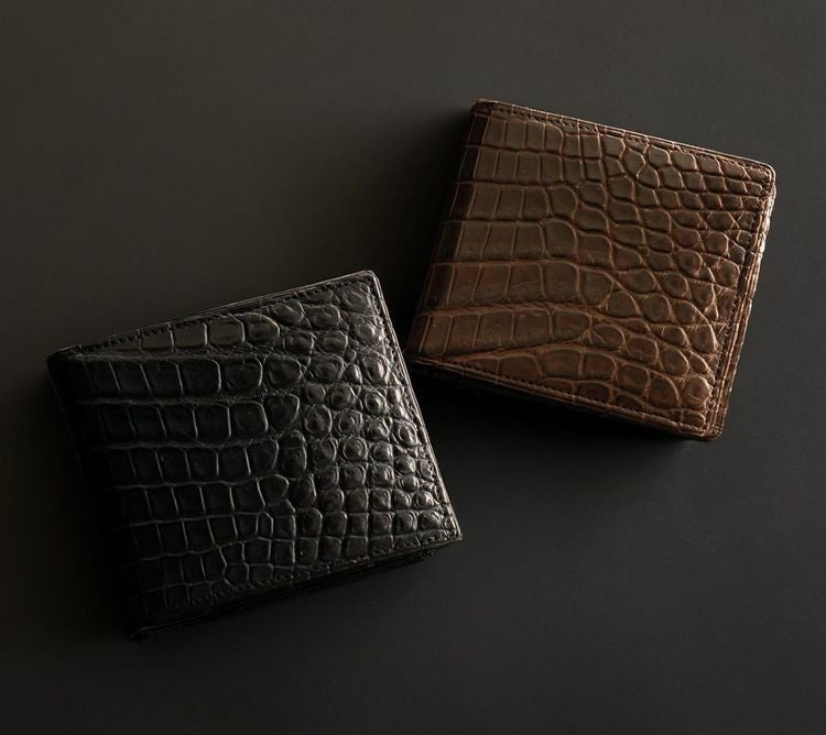 マット加工のナイルクロコダイルで仕立てたシンプルな二つ折り財布。