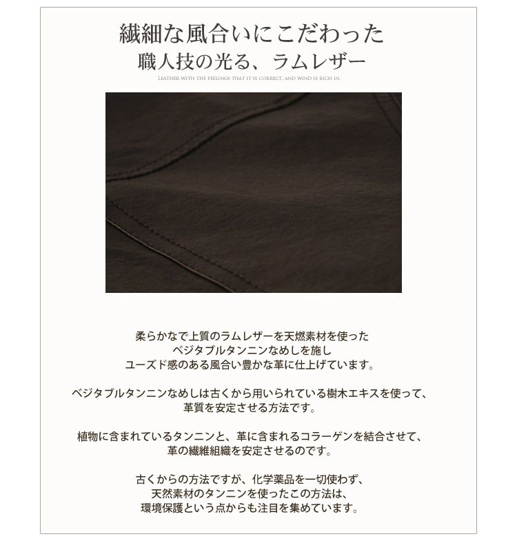 柔らかで上質なラムレザーを、天然素材を使った、ベジタブルタンニンなめしを施し、