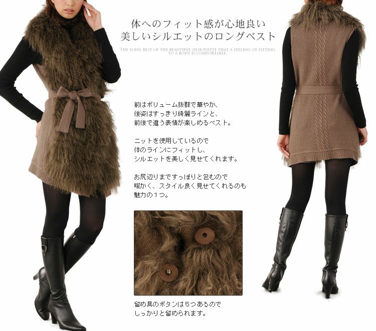 チベットラム&ニット ロングベスト アウター ウール 女性用 ロング丈 ファー 毛皮 ファーベスト リアルファー 秋 冬 母 女性 プレゼント ギフト