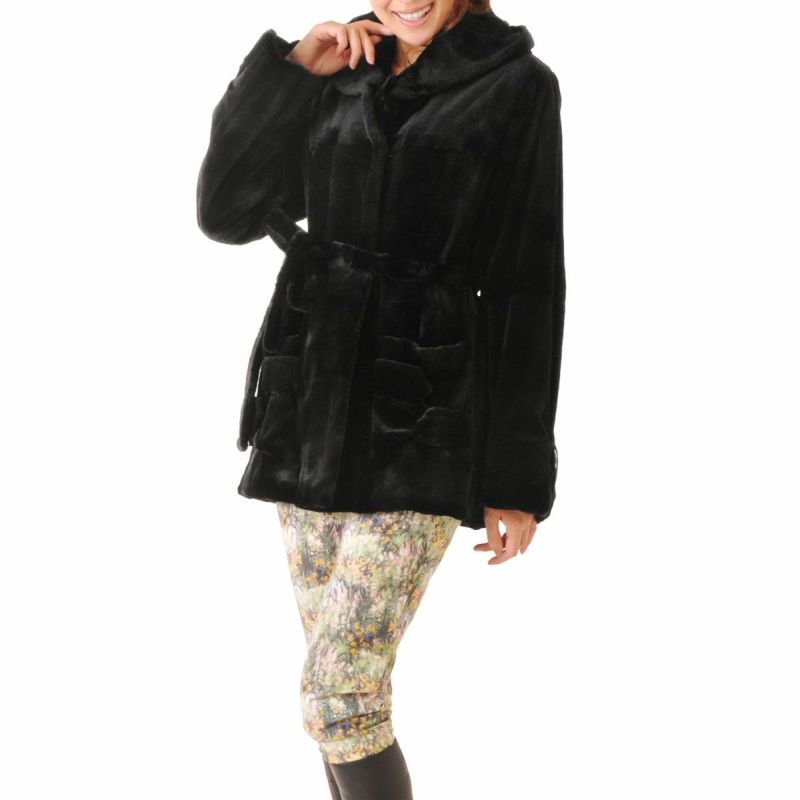シェアード ウィーゼル ハーフコート フード付き ファーコート レディース ラグジュアリー ファー 高級毛皮 高級素材 ブラック パーティー M L ベルト 秋 冬 プレゼント ギフト 母 女性 ギフト