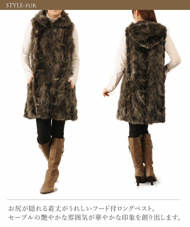 シルク100%&セーブル ロング ベスト リバーシブル フード付き 7F