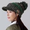 大きめのポンポンがアクセントになった、つば付きデザインのニット帽。
