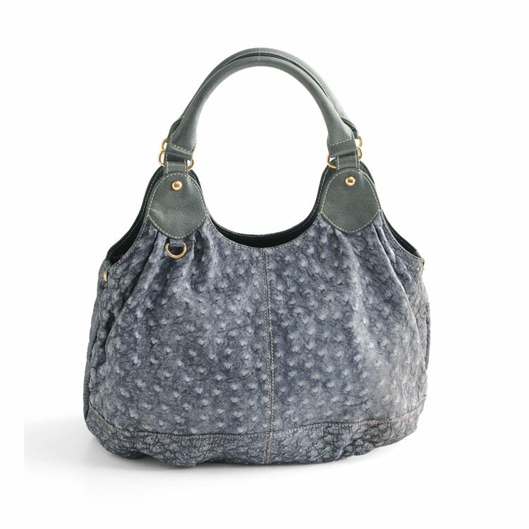 オーストリッチ ハンドバッグ ギャザー デザイン デニム染め クマちゃん チャーム 付き 4FB