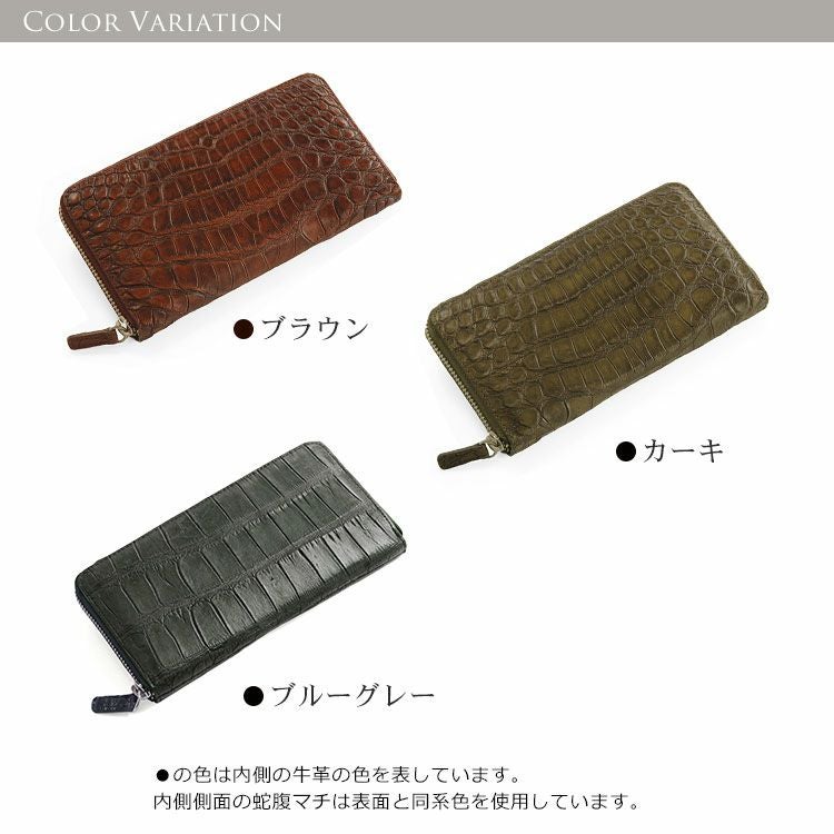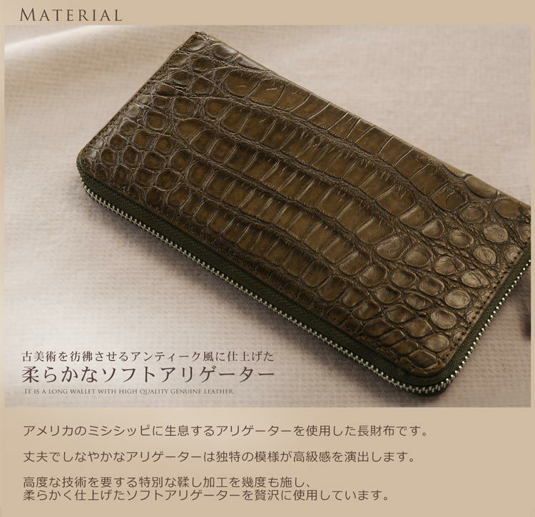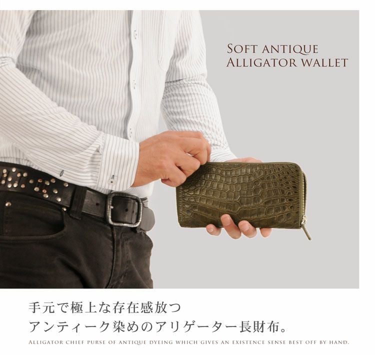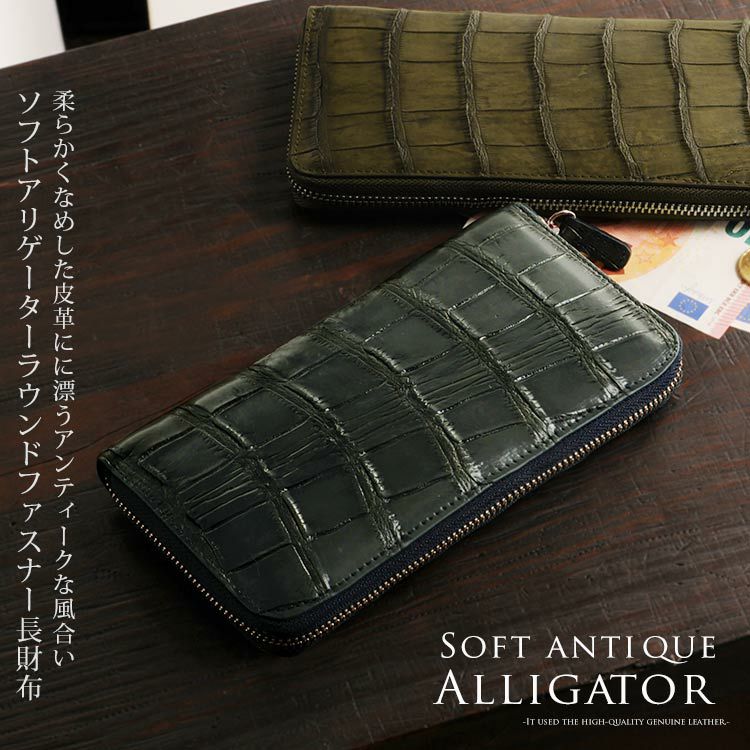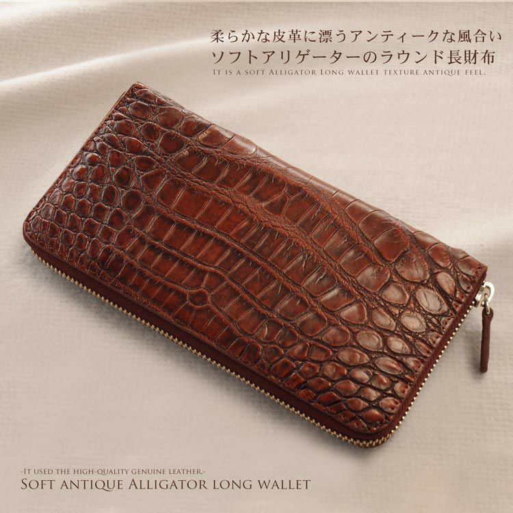 | 商品名:ソフト アリゲーター 長財布 アンティーク 染め ラウンド メタルファスナー / メンズ |