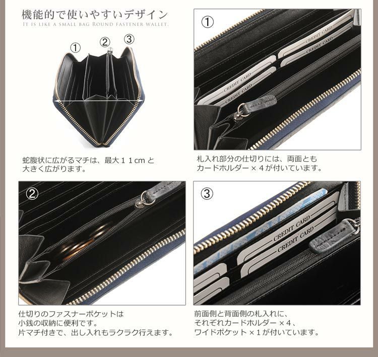 開閉はぐるりと「コの字」型に大きく開き使いやすいラウンドファスナー式。