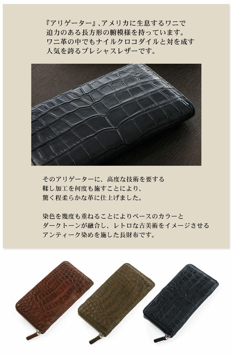 レトロさがお洒落で味のある、アンティーク染めのアリゲーター本革長財布。