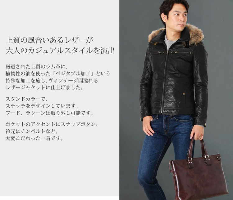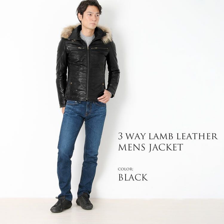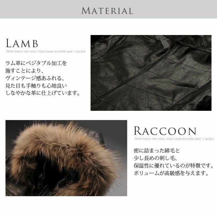 ラム レザージャケット フード付 ラクーン トリミング メンズ ブラック M/L/LL 7F