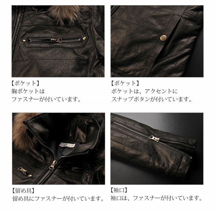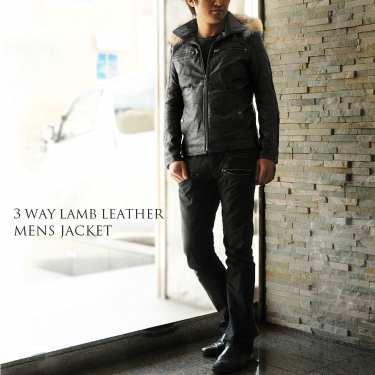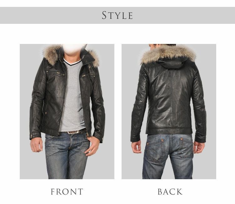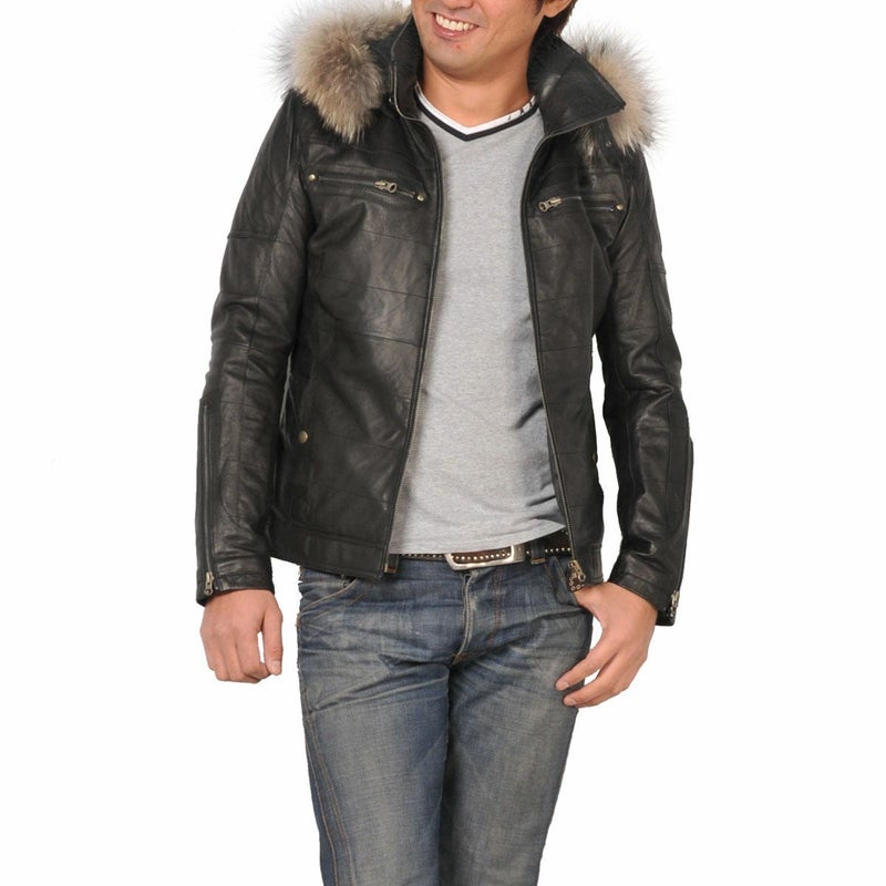 | 商品名:ラム レザージャケット フード付 ラクーン トリミング 秋冬 メンズ ブラック M/L/LL |