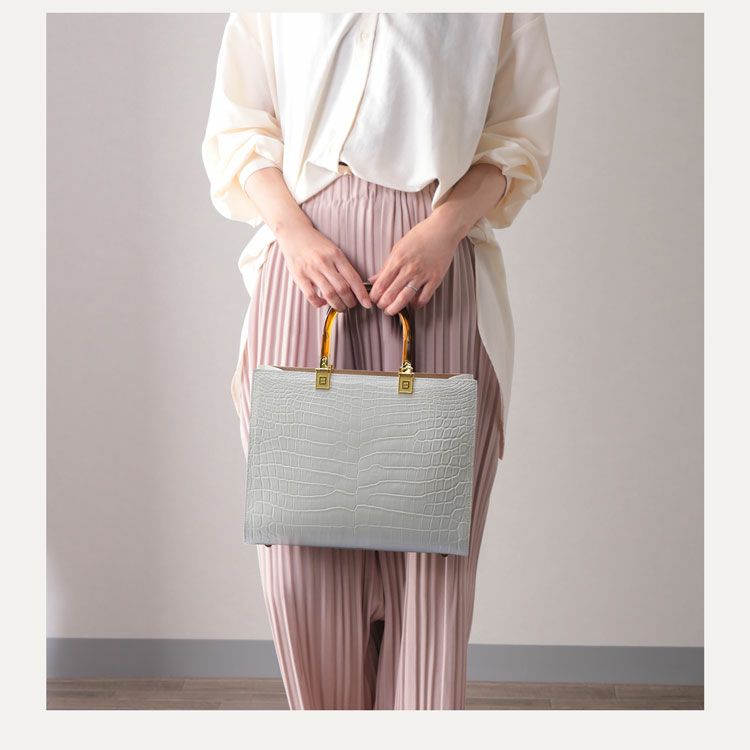 ホワイトカラーのクロコダイルに、べっ甲調のハンドルとゴールド金具を使用。