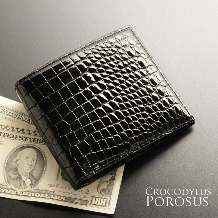 | 商品名:スモール クロコダイル 折り財布 シャイニング 加工 センター取り 一枚革 無双 ヘンローン 横幅11.5cm メンズ |
