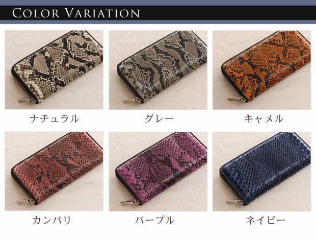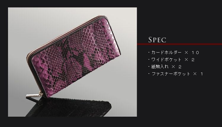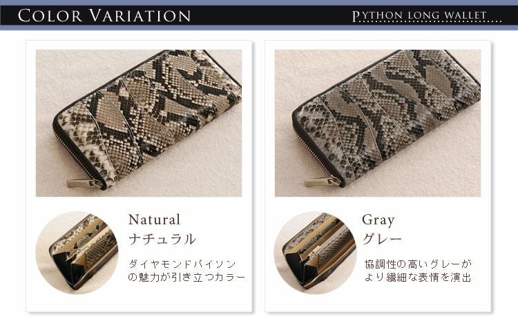 パイソンレザー(蛇革)は柔らかで軽いのが魅力で財布などの素材としてはとても優秀な爬虫類の本皮です。ヘビ柄が独特な模様を描くダイヤモンドパイソンや、世界的にも流通の多いモラレスパイソン、ヤスリヘビやウォーターパイソン、スネークなど様々な種類のヘビ革があり、その存在感が人気のエキゾチックレザーです。男性女性問わず根強いファンが多く美しい鱗もようが魅力のポイント。かっこいい印象のベリーカットから上品な佇まいのバックカットまで革の取り方でも雰囲気が変わる表情豊かな素材です。使い込むほどに手に馴染む経年変化(エイジング)も楽しめるリアルレザーなので、デイリーに使う財布や革小物にへび革を加えると、いっそう愛着の湧くアイテムへと育ってくれます。普段どおりに使用していればウロコが剥がれたりすることも無く、丈夫で長い間使い込むことが出来ます。金運などの縁起物としても人気が高く、世代を問わず愛される蛇革の財布やレザー小物をご堪能いただければと思います。