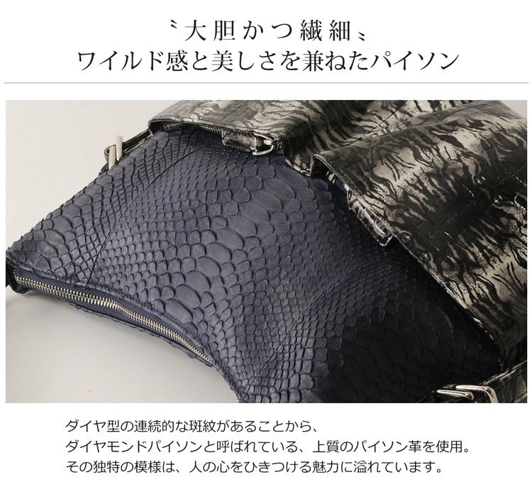 ダイヤ型の連続的な斑紋があることから、ダイヤモンドパイソンと呼ばれている、上質のパイソン革を使用。
