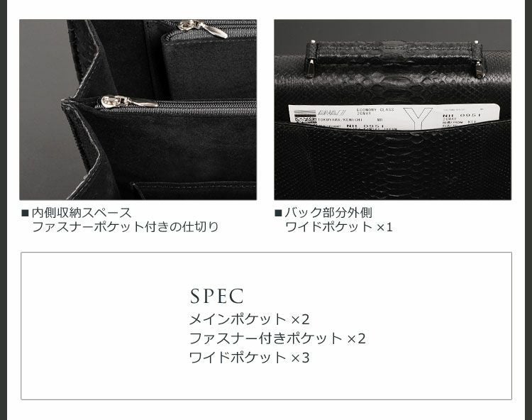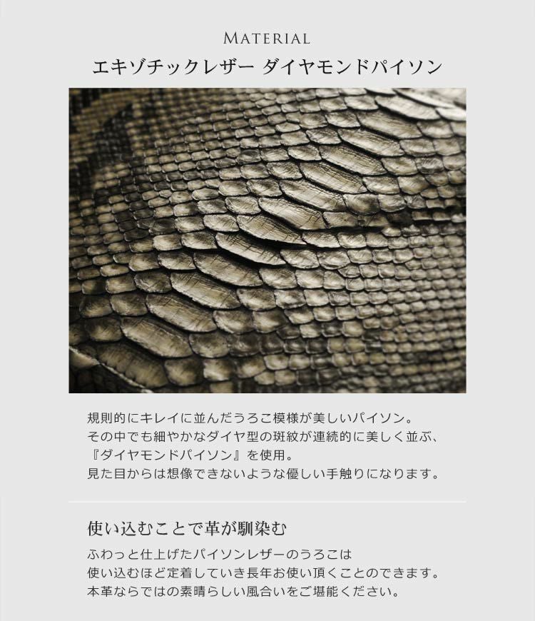| 素材 | 表側:ダイヤモンドパイソン 内装:スエード調の生地、一部牛革 |