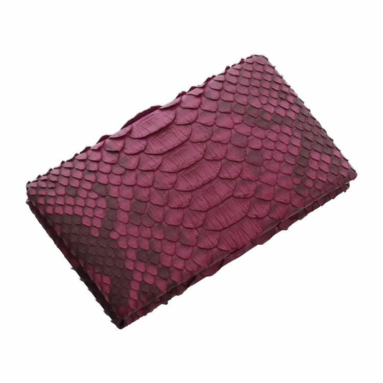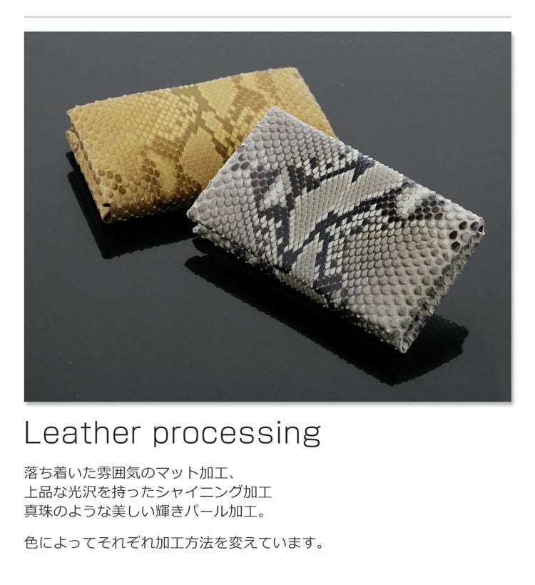 パイソンレザー(蛇革)は柔らかで軽いのが魅力で財布などの素材としてはとても優秀な爬虫類の本皮です。ヘビ柄が独特な模様を描くダイヤモンドパイソンや、世界的にも流通の多いモラレスパイソン、ヤスリヘビやウォーターパイソン、スネークなど様々な種類のヘビ革があり、その存在感が人気のエキゾチックレザーです。男性女性問わず根強いファンが多く美しい鱗もようが魅力のポイント。かっこいい印象のベリーカットから上品な佇まいのバックカットまで革の取り方でも雰囲気が変わる表情豊かな素材です。使い込むほどに手に馴染む経年変化(エイジング)も楽しめるリアルレザーなので、デイリーに使う財布や革小物にへび革を加えると、いっそう愛着の湧くアイテムへと育ってくれます。普段どおりに使用していればウロコが剥がれたりすることも無く、丈夫で長い間使い込むことが出来ます。金運などの縁起物としても人気が高く、世代を問わず愛される蛇革の財布やレザー小物をご堪能いただければと思います。