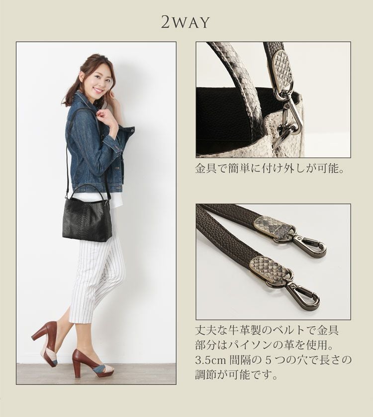 ショルダーベルトが付いていて2Wayで持てるヘビ革ハンドバッグ。