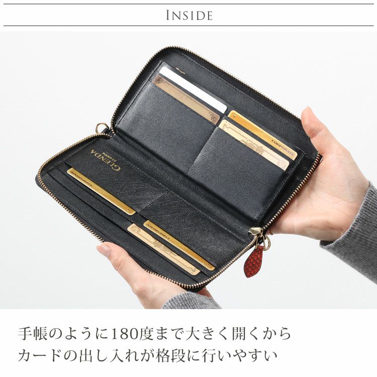 | 内側収納 | ・紙幣入れ×1 ・ファスナー付き小銭入れ×1 ・カードホルダー×12 ・ワイドポケット×3 |
