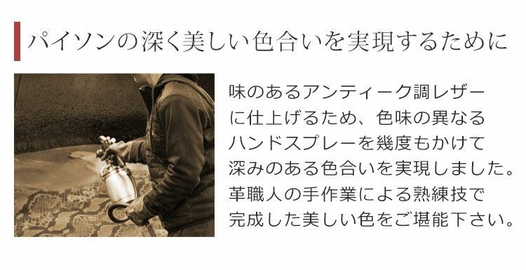 パイソンも牛革もハンドスプレーで何度も色を重ね、味のあるアンティーク調レザーに仕上げています。