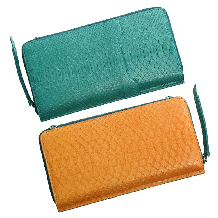 ダイヤモンドパイソンを使用したバイカラーデザインのお財布バッグ。