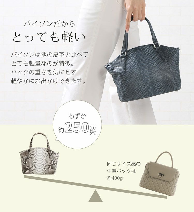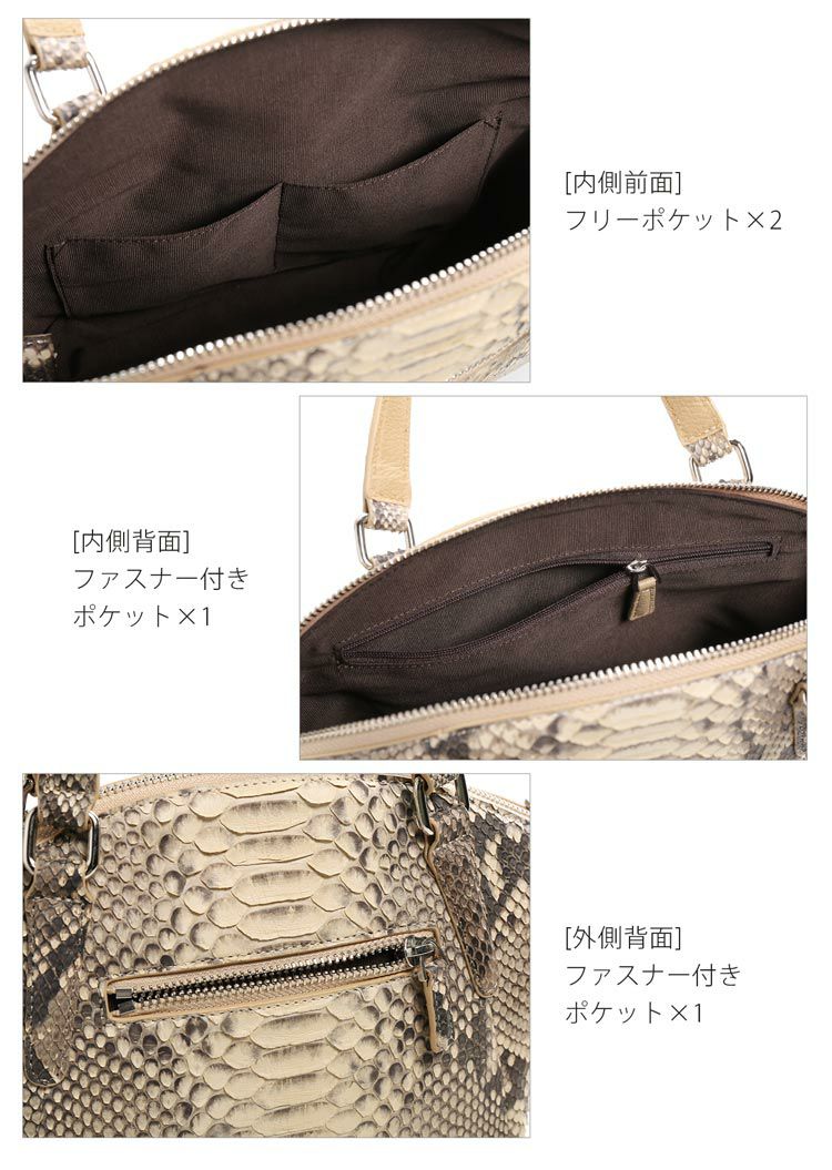 | 素材 | 表側:ダイヤモンドパイソン(本革)、一部牛革 内装:生地 |