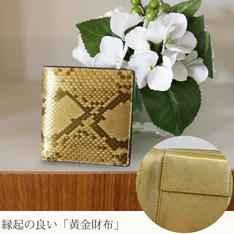 キラキラと宝石のように輝く美しいゴールドカラーのパイソン財布は、縁起が良く、お金が貯まる財布と言われています。
