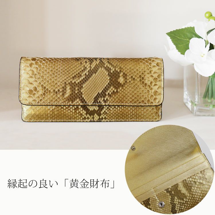 キラキラと宝石のように輝く美しいゴールドカラーのパイソン財布は、縁起が良く、お金が貯まる財布と言われています。