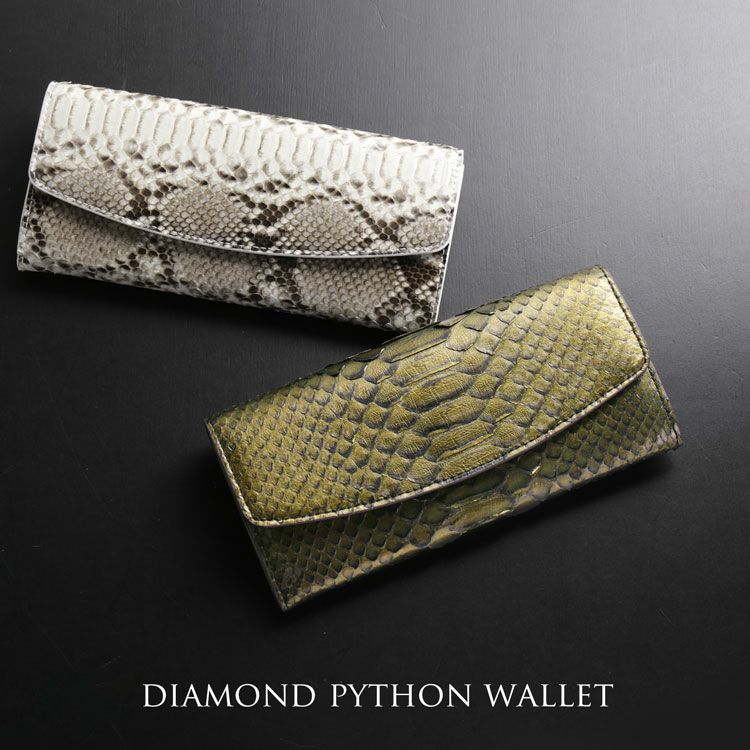 スナップボタンでかぶせが開く、ダイヤモンドパイソンの長財布。