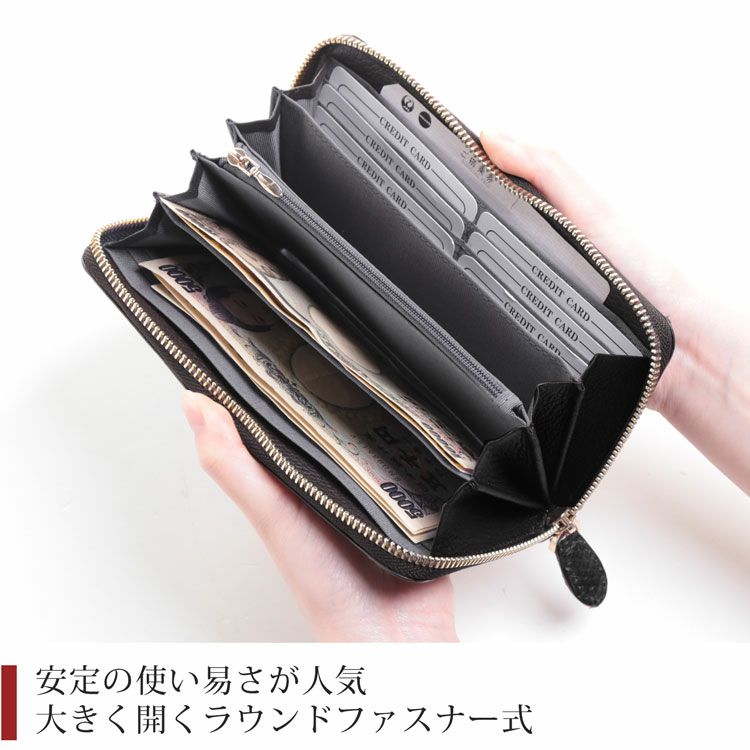ラウンドファスナー式で大きく開くので中の確認がしやすく、お会計もらくらく行えます。