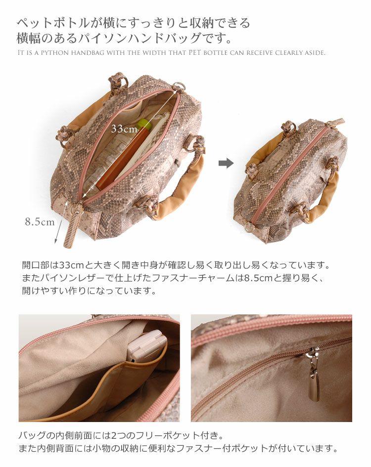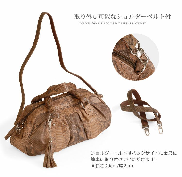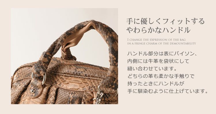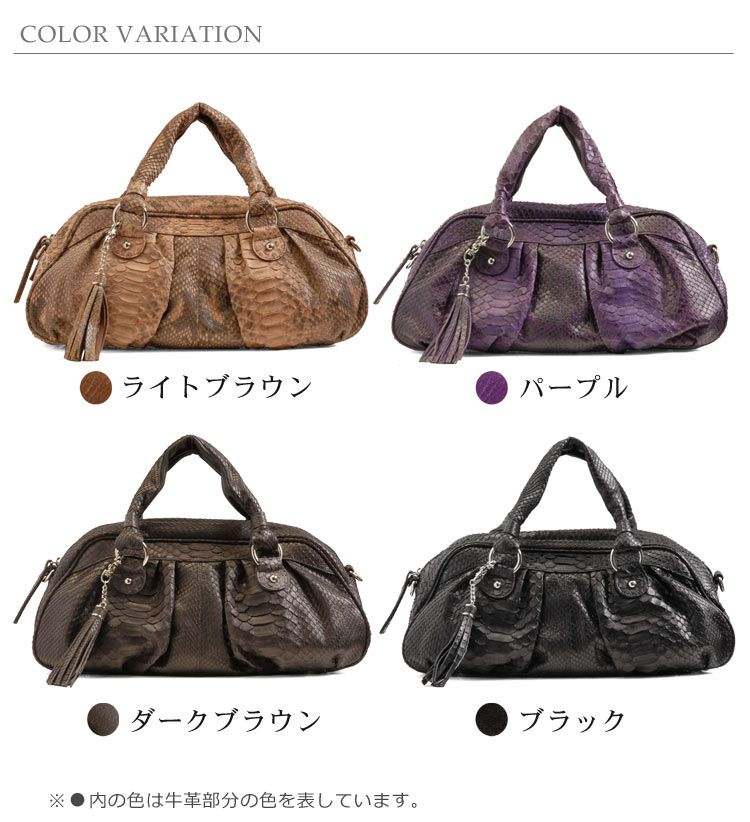| 素材 | 表側:パイソン 内装:スエード調の生地 ※ハンドルやショルダーベルトの裏側に牛革(本革)を使用しています。 |