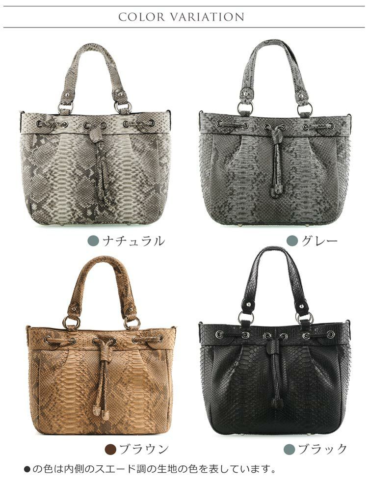 | 商品名:パイソン トートバッグ レディース 大きめ A4 対応 2WAY 斜めがけ イタリア製 蛇革 使用 本革 革紐 フリンジ デザイン ナチュラル/グレー/ブラウン/ブラック |
