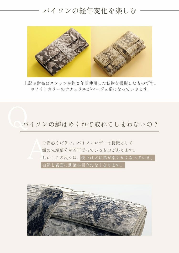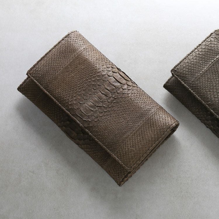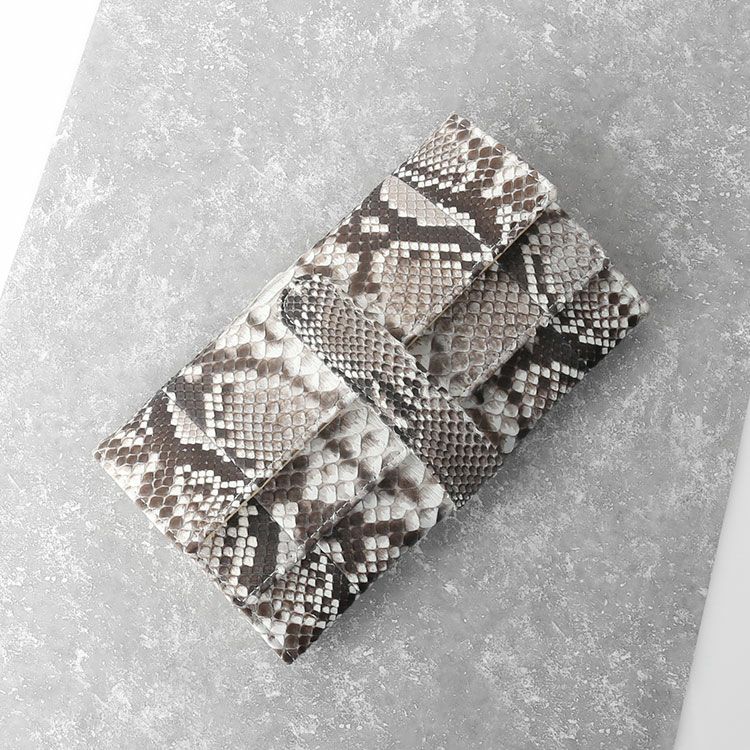 パイソンは、迫力ある表情からは想像できない、繊細で優しい手触りです。加工種類はあまり多くないパイソンですが、素材感を長く楽しむレザー本格派に人気のエキゾチックレザーとなります。スタイルにプラスするだけで、上品な華やかさを添えてくれるアイテムです。