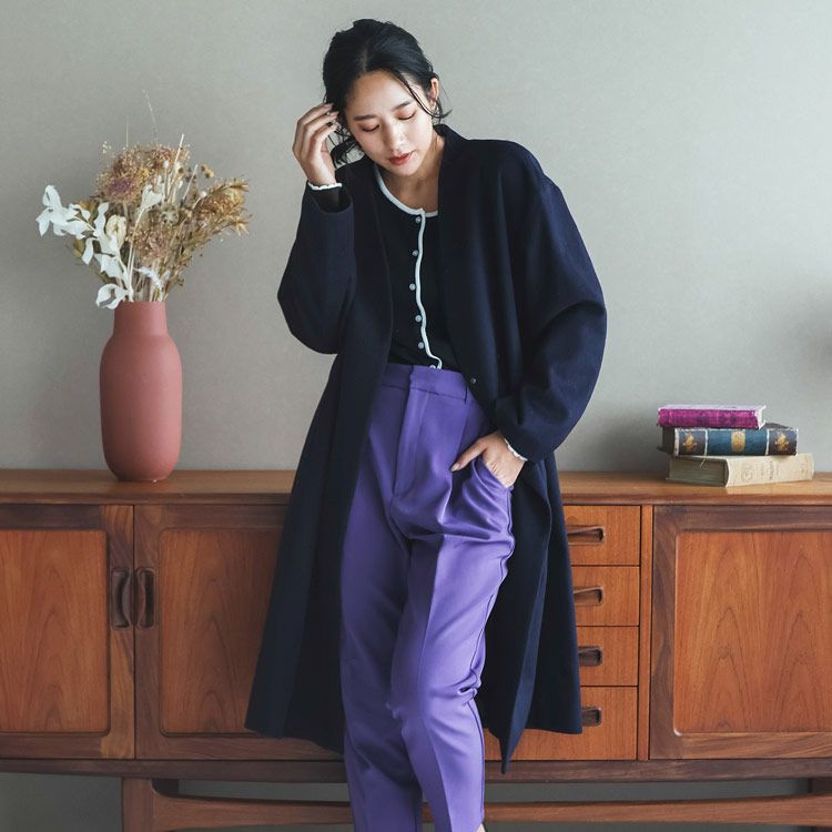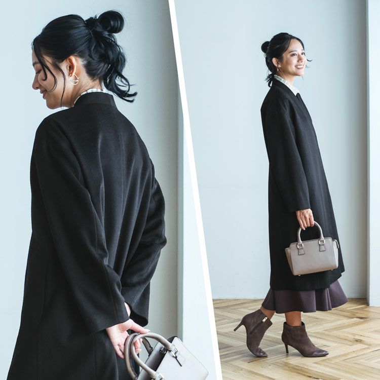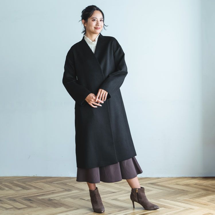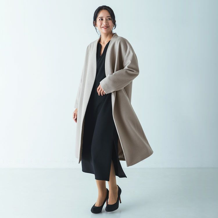 すっきりとしたVネックのノーカラーで、着丈106cmのロング丈コート。