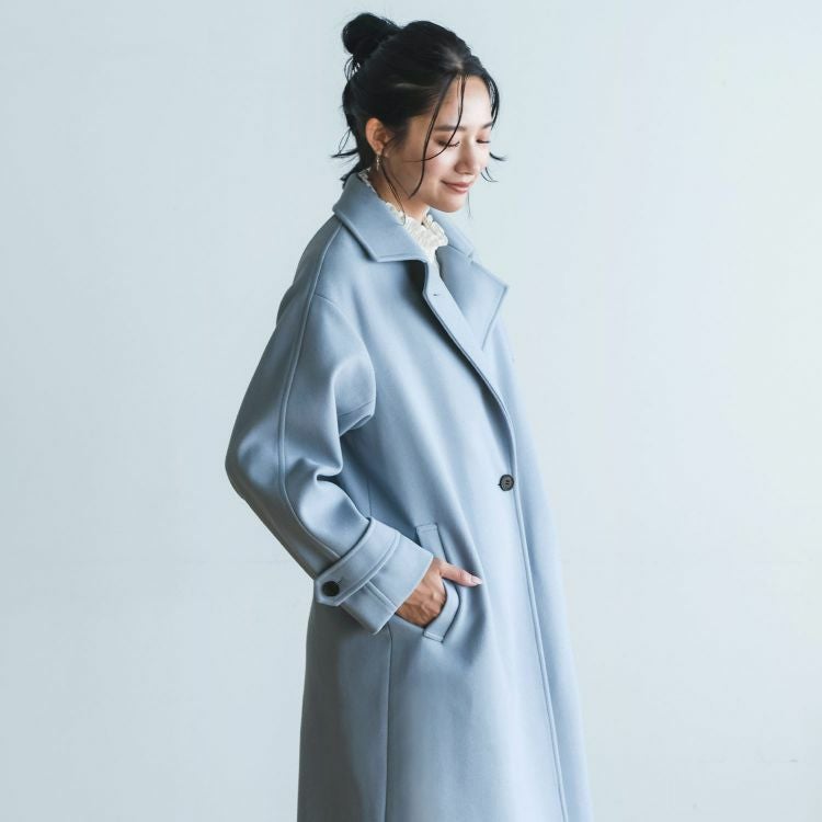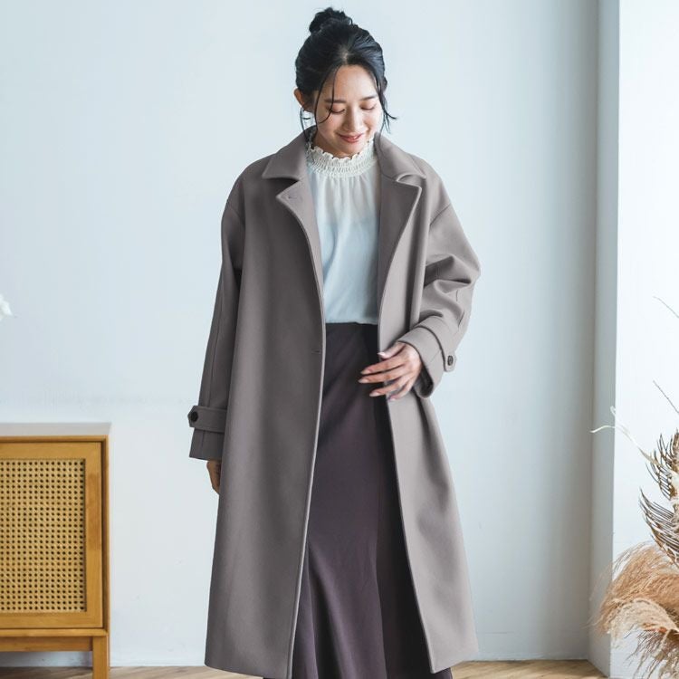 定番のテーラードカラーでシンプルにまとめたロング丈のチェスターコート。