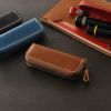 シンプルでコンパクトな 栃木レザーの印鑑ケースです。 「コ」の字型ファスナーが開く ラウンドファスナー式で、 大切な印鑑を きちんと収納しておくことができます。 上品な栃木レザーの風合いが魅力で 贈り物などギフトとしても 選ばれているアイテムです。 栃木レザーは、北米の広大な牧場で 大きく元気に育った牛の原皮を使用しています。 栃木のタンナーの元で、大きく分けても 20にも及ぶ伝統的な技法工程を経ることにより、 日本で最高峰と呼ばれる 「ヌメ革」に仕上がっています。 しっとりと手に吸い付き馴染むような ソフトな肌触りと、本革ならではの 味のある表情・光沢感が魅力の日本製レザーです。 内装は仕切りのないシンプルな造りで、 シャチハタの印鑑が2つ 収納可能な大きさです。 印鑑ケース以外にも様々な使い方が出来る革小物です。 USBメモリやカードリーダー、SDカードなど PC関連のアクセサリの収納などにも使えます。 リップクリームやお薬など、様々な物を携帯できます。 重量:約20g