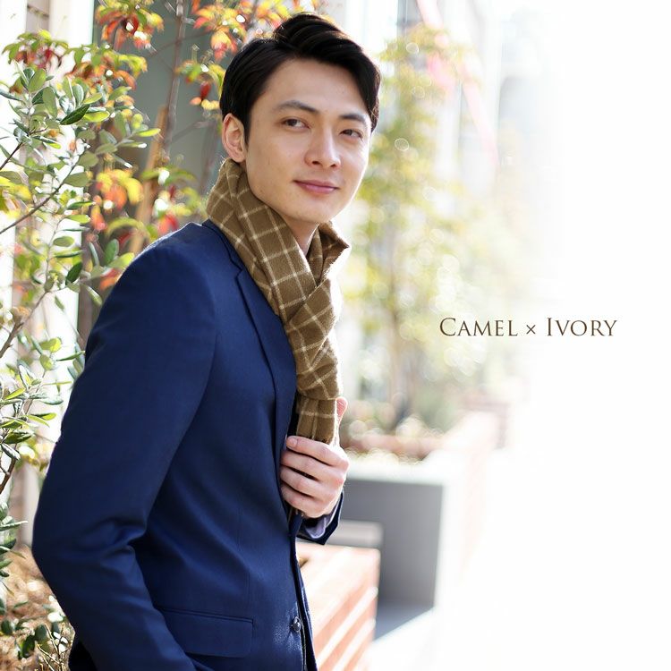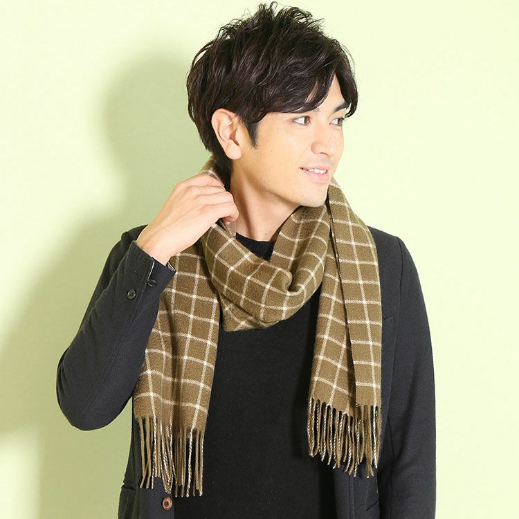 カシミヤ 100% マフラー ウィンドウペン チェック キャメル