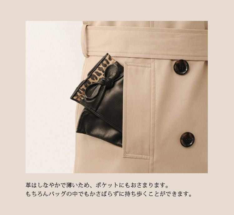 【名入れ 別途購入で可能】【ネコポスで送料無料】 ラム革手袋 リボン/ レオパード柄 デザイン レディース 7F