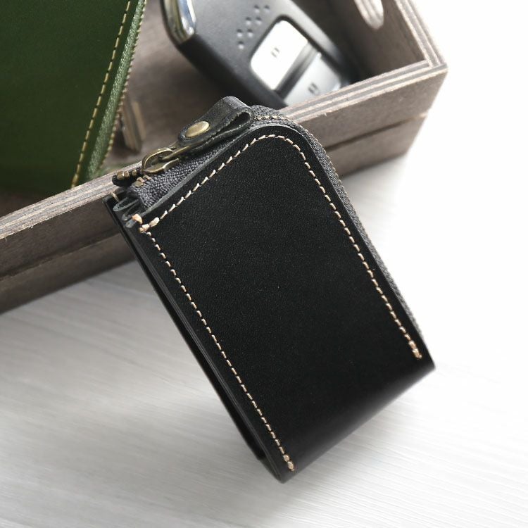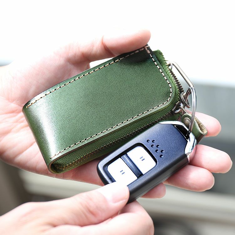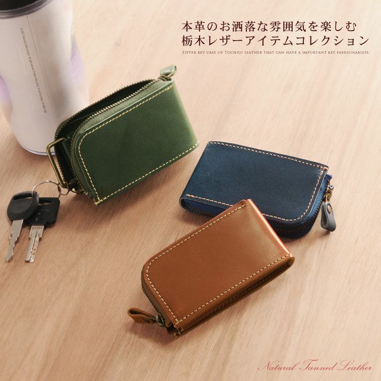 スマートキーケース+αを入れるのに ちょうど良いサイズの コンパクトなスマートキーケースです。 L字ファスナーで開閉し、 蛇腹マチが扇型に大きく開くので 使い易さも抜群の 日本製本革小物です。 栃木レザーは、北米の広大な牧場で 大きく元気に育った牛の原皮を使用しています。 栃木のタンナーの元で、大きく分けても 20にも及ぶ伝統的な技法工程を経ることにより、 日本で最高峰と呼ばれる 「ヌメ革」に仕上がっています。 しっとりと手に吸い付き馴染むような ソフトな肌触りと、本革ならではの 味のある表情・光沢感が魅力の日本製レザーです。 開口部はL字型のファスナーになっており、 ちょうどつかみやすい大きさの ファスナーチャームが付いているので 開閉がとてもスムーズに行えます。 片側は蛇腹マチになっており、 開口部がとても大きく開きます。 内装の可動式の金具に キーリングが2つ付いています。 ブランドネーム[Jamale]の刻印が 内側背面にデザインされています。 重量:約50g