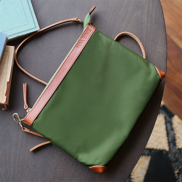 革にはヌメ革を使用。ナイロンには高級感のある滑らかなツヤが特徴的な国産ナイロンを使用。