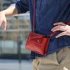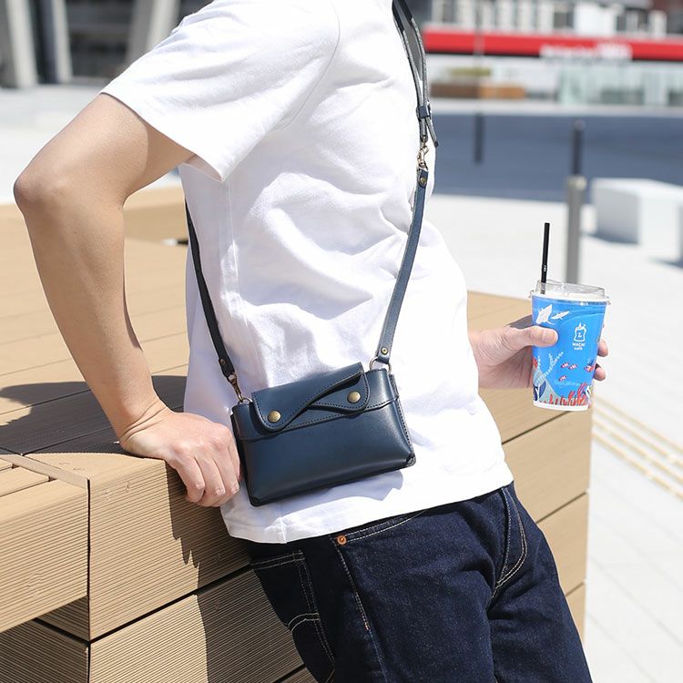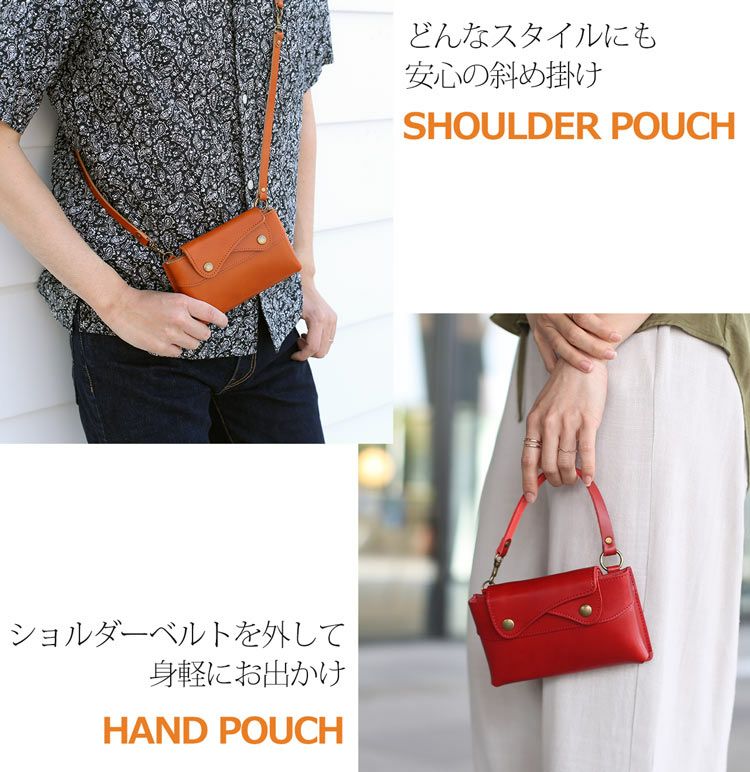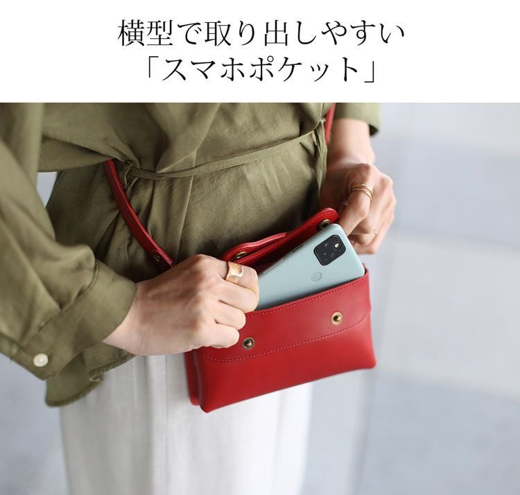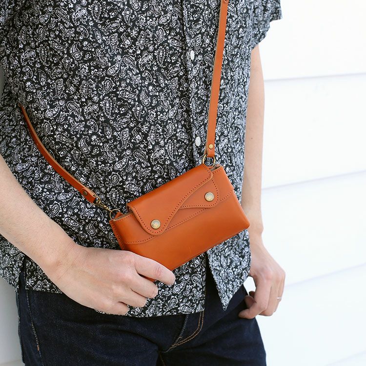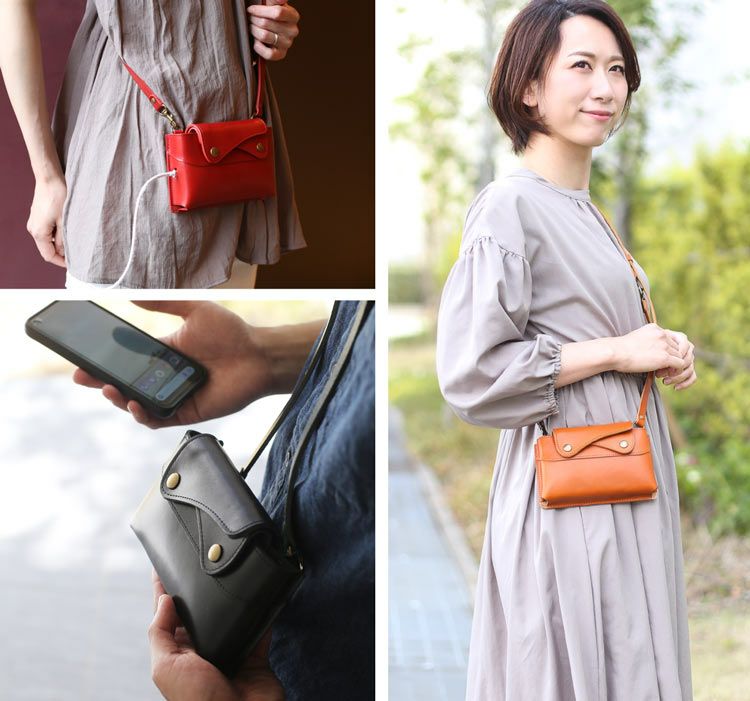 ショルダーウォレットのように肩から下げたままお金やスマホをパッ!と取り出せます。