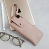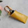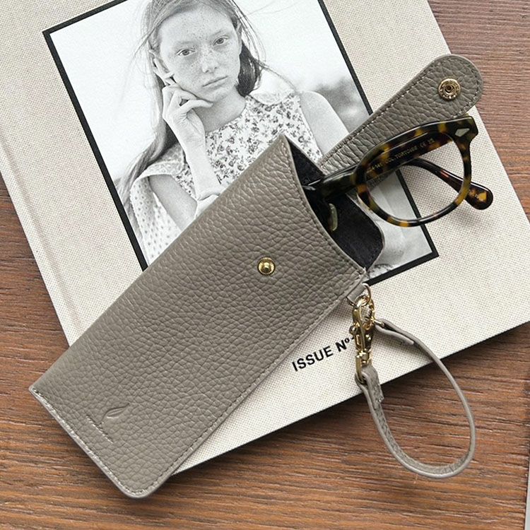 バッグの外側に付けられるストラップ付きの本革メガネケースです。