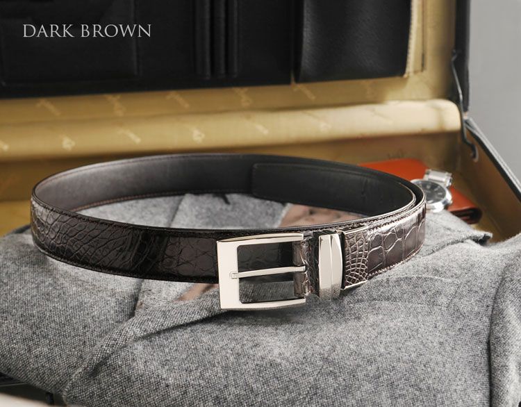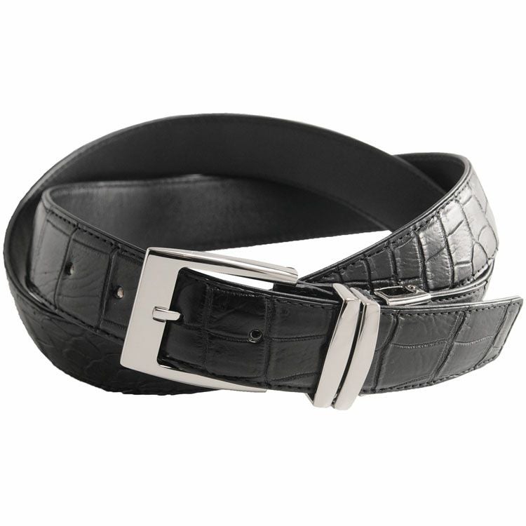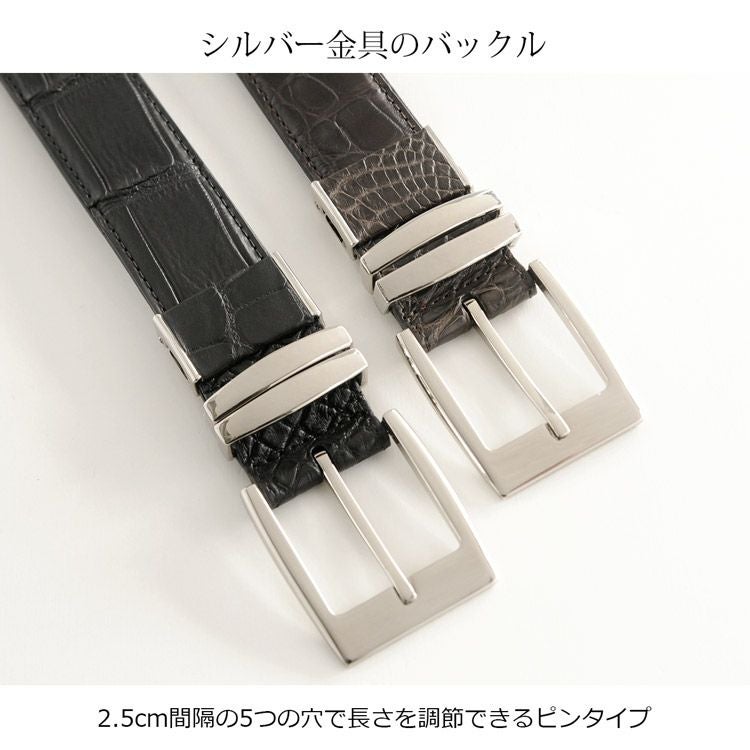 大きなシルバー金具のバックルが重厚感のあるデザインのクロコダイルベルト。