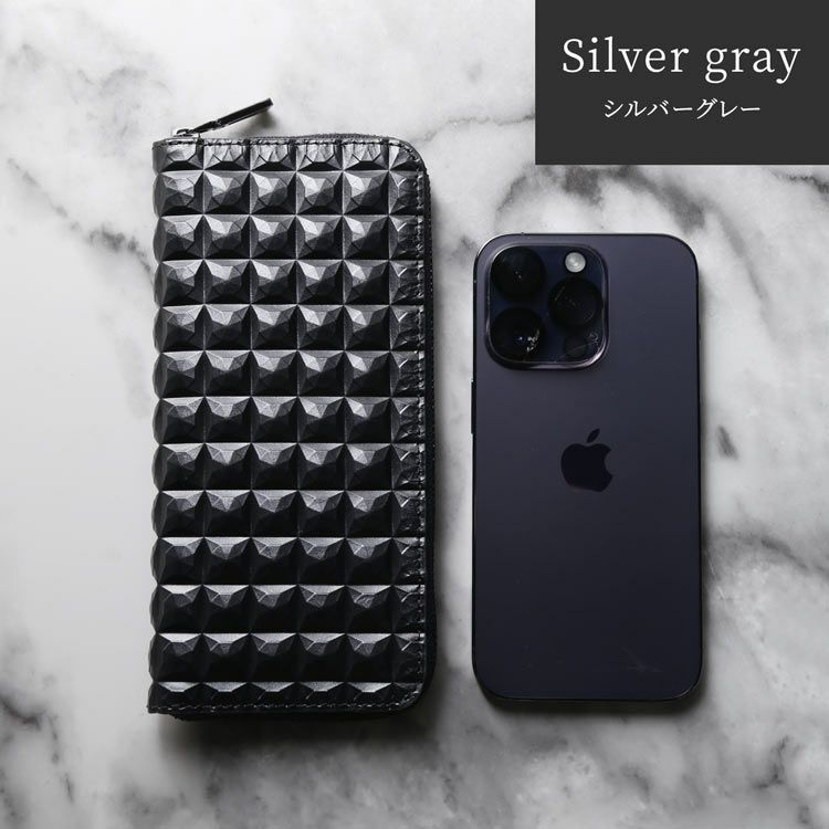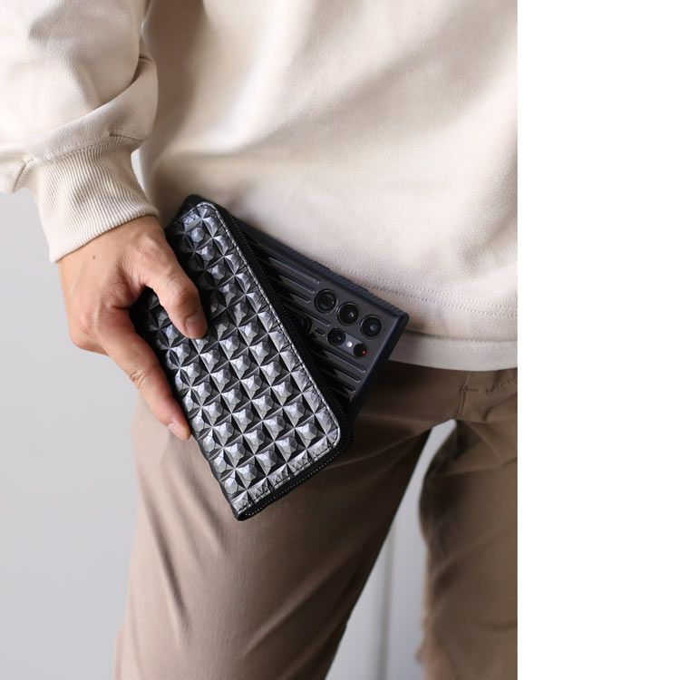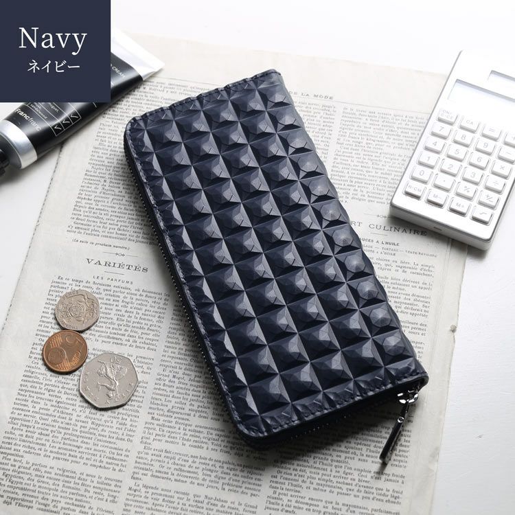 どの角度から見ても美しい、立体的な3Dデザインの牛革を使用した長財布。 見る角度によって変わる表面の陰影が未来的かつ独創的で、 そっと置いてあるだけで、他にはない唯一無二の存在感を放ちます。 また、お札がピッタリ入る最小クラスのサイズ感で、 手に持ちやすいスマートな財布に仕上がっています。 どこから見ても美しい立体的な3Dデザインテクスチャの牛革。 陽極と陰極という二つの鏡板の間に革を挟む特殊な工程で作られており、 普通の型押しでは味わえない独特な革の質感とデザインが特徴的です。 お札を曲げずに入れられるコンパクトサイズの長財布。 お札がファスナーに絡まずスムーズに出し入れが出来る 絶妙のサイズを追求し、最小の長財布を目指しました。 ファスナーがしっかり閉じるため中身が飛び散らない、 安心感のあるラウンドファスナー長財布。 小銭入れはワンアクションで小銭が取れる留め具のないつくりが魅力的。 シンプルで中の視認性も良く、直感的に扱える使いやすい財布です。 ファスナーはブラックカラーのファスナーを使用。 カード入れ部分にHALEINEのブランドロゴが入っています。