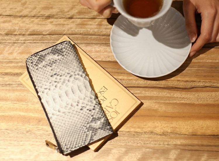 ヘビ革の手触りはやさしく、使うほどに手に馴染み柔らかく育っていきます。