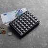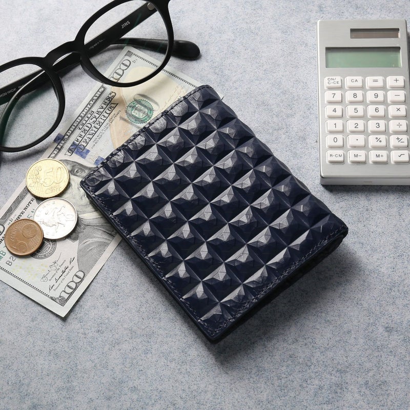 どの角度から見ても美しい、立体的な3Dデザインの牛革を使用した2つ折り財布。 見る角度によって変わる表面の陰影が未来的かつ独創的で、 そっと置いてあるだけで、他にはない唯一無二の存在感を放ちます。 どこから見ても美しい立体的な3Dデザインテクスチャの牛革。 陽極と陰極という二つの鏡板の間に革を挟む特殊な工程で作られており、 普通の型押しでは味わえない独特な革の質感とデザインが特徴的です。 普段使いにうれしい小さめサイズ。 軽いので持ち歩きにとても便利です。 カードホルダー5つ、小銭入れと紙幣入れが1つずつと、 シンプルな作りで使いやすいです。 小銭入れにはマチがあり、大きく開くのでお会計の際などもスムーズになります。 留め具はスナップボタンを使用し、簡単に開け閉めできます。 ファスナーはブラックカラーのファスナーを使用。 カード入れ部分にHALEINEのブランドロゴが入っています。