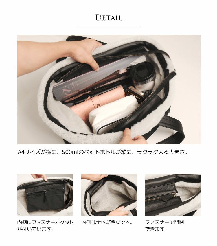 | 素材 | ムートン(羊革)、ピッグレザー(豚革:ハンドル・ファスナー周り) 綿80%/ポリエステル20%(内側ポケット) |