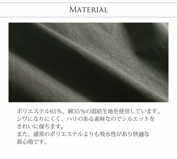 ポリエステルと綿の混紡素材を使用し、程よいハリできれいなシルエットを保ちます。