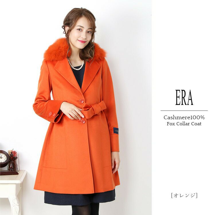 ERA/エラ カシミヤ 100% コート フォックス 襟 コート 着丈90cm レディース 冬 ライトベージュ/オレンジ/ブラック 母 女性 プレゼント ギフト