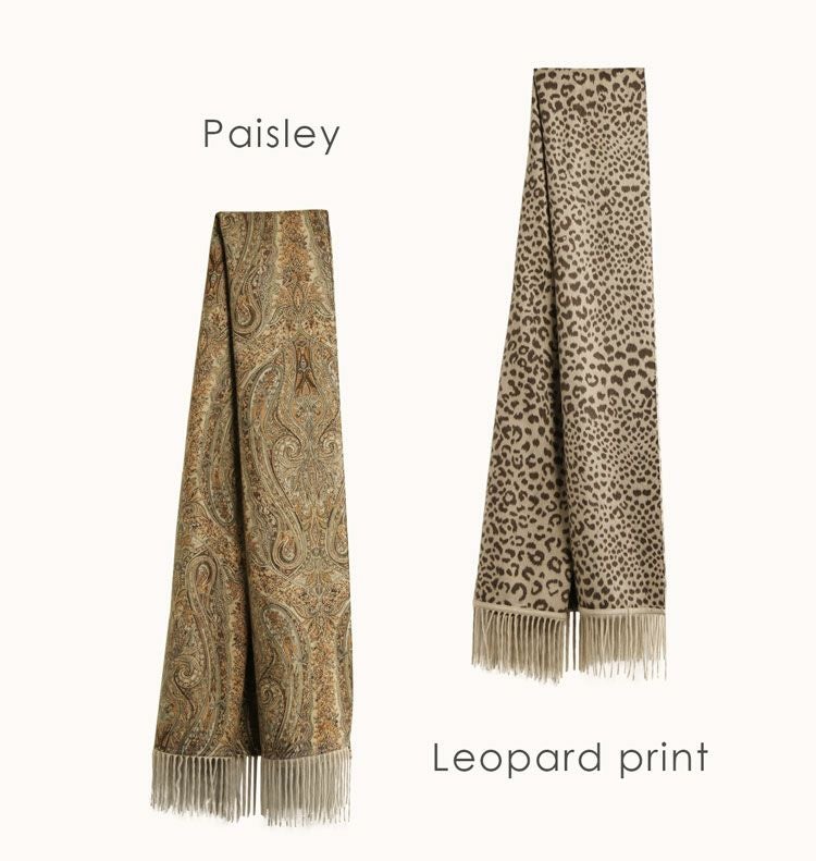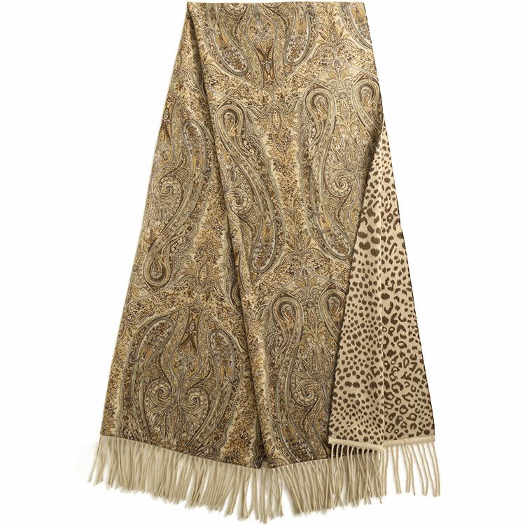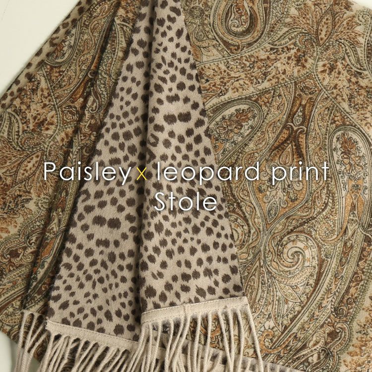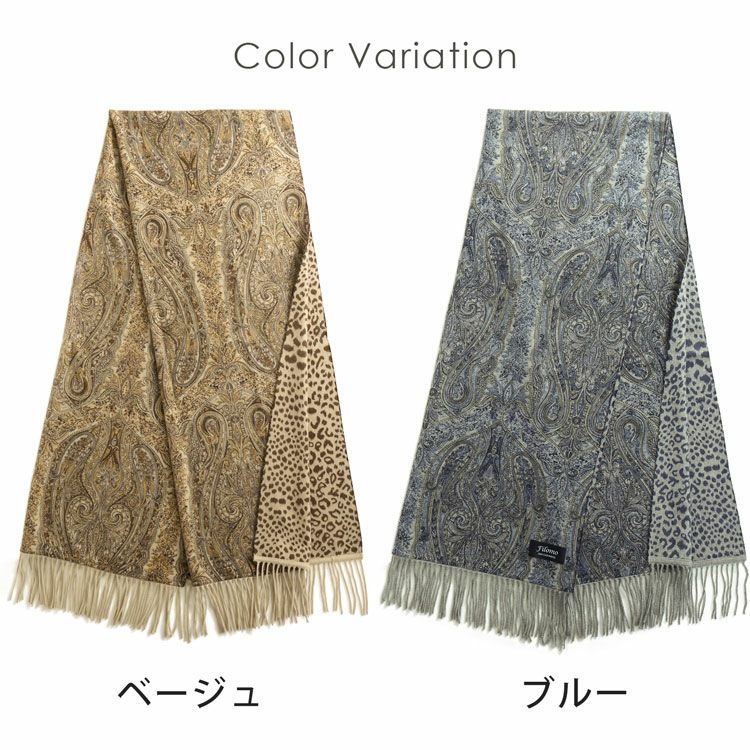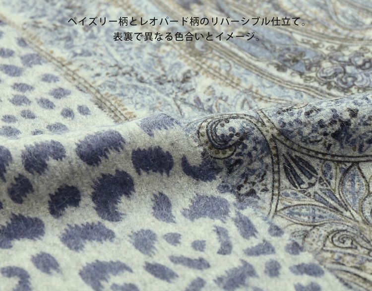 両端にフリンジ付きで、ペイスリー柄とレオパード柄のリバーシブル仕様が特徴です。