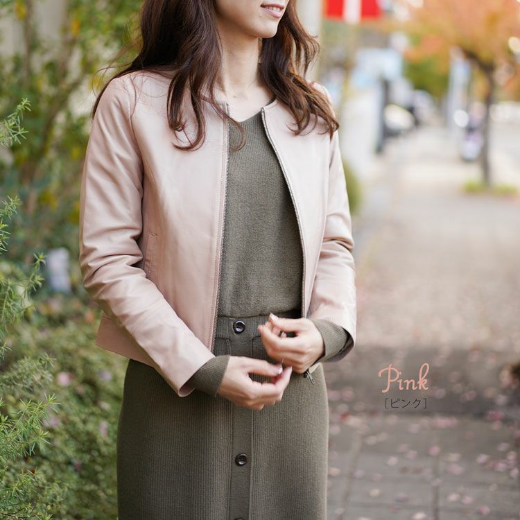 レザージャケット レディース ノーカラー 本革 ラム シンプル ショート丈 ライトアウター 春 アウター スプリング 秋 ブラック ブラウン ベージュ ピンク 軽量 上品 ギフト プレゼント ギフト