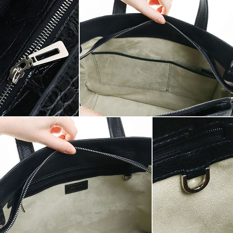 クロコダイルと並ぶ人気の鰐革、アリゲーターを使用したバッグです。 革には美しい光沢を放つシャイニング加工(グレージング仕上げ)を施しており、 まるで本物の宝石のような美しさが魅力です。 持ち手の内側や開口部には、丈夫な牛革を使っています。 天ファスナーでバッグが開き、しっかりとマチがあるため収納力は抜群です。 A4ファイルやノートパソコンが入るのでビジネスシーンにも使えます。 【内側収納】フリーポケット×2・ファスナー付きポケット×1・Dカン ショルダーベルトが付いた2WAY仕様のバッグです。