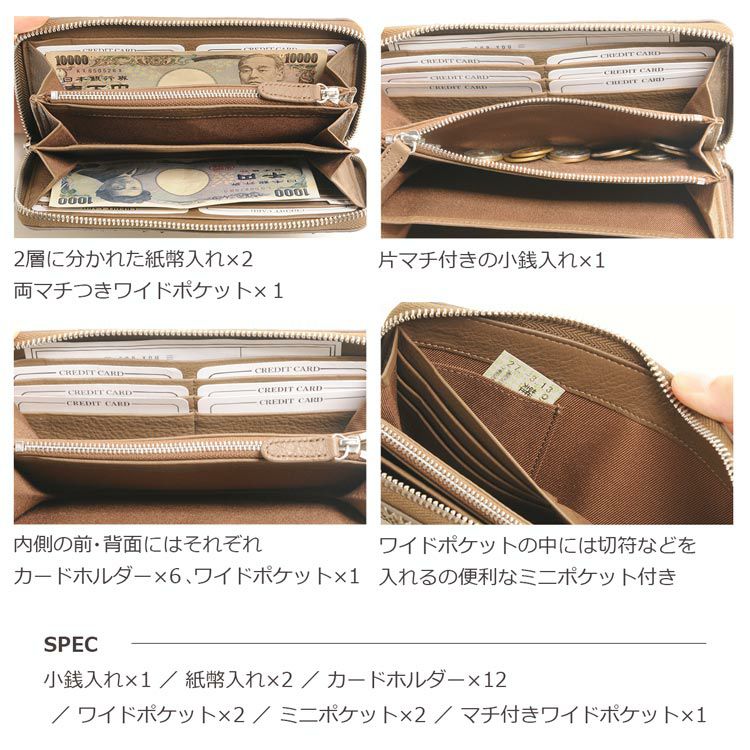小銭入れ×1 紙幣入れ×2 カードホルダー×12 ワイドポケット×2 ミニポケット×2 マチ付きワイドポケット×1 |